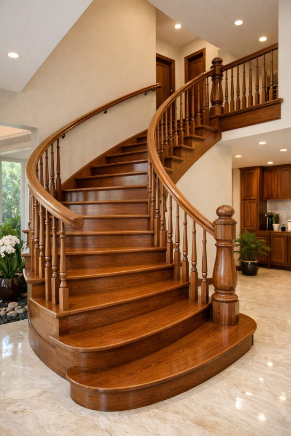 Cầu thang uốn là kiểu cầu thang có những bậc thang được bố trí theo hình vòng cung hoặc chữ L. Ưu điểm của kiểu dáng này là tạo nên sự thanh thoát, tăng tính thẩm mỹ cho không gian. Cầu thang uốn thường được sử dụng trong các không gian rộng rãi như villa, biệt thự.