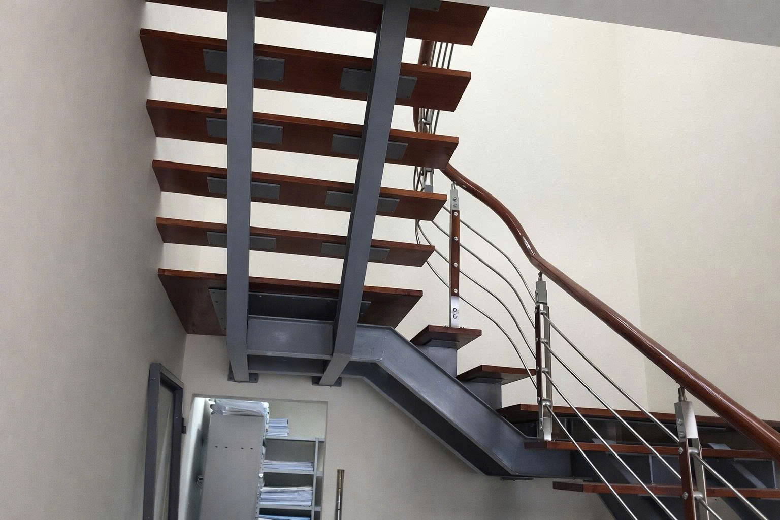 Không chỉ đẹp, cầu thang hình xương cá còn gây ấn tượng nhờ khả năng tối ưu không gian vượt trội. Nhờ thiết kế gọn, phần dưới cầu thang có thể tận dụng làm tủ chứa đồ, giá sách hoặc khu trang trí giúp tăng chức năng sử dụng. Đặc biệt trong nhà phố có chiều ngang nhỏ, việc áp dụng mẫu cầu thang này giúp kiến trúc tổng thể thông thoáng hơn rất nhiều. Bên cạnh đó, độ bền cao của loại cầu thang này cũng là lý do nhiều gia chủ lựa chọn. Khung thép và hệ đỡ chắc chắn giúp thang chịu lực tốt, đảm bảo an toàn khi sử dụng lâu dài. Ngay cả những công trình yêu cầu độ chính xác cao, cầu thang hình xương cá vẫn đáp ứng tốt nhờ cấu trúc được tính toán hợp lý.
