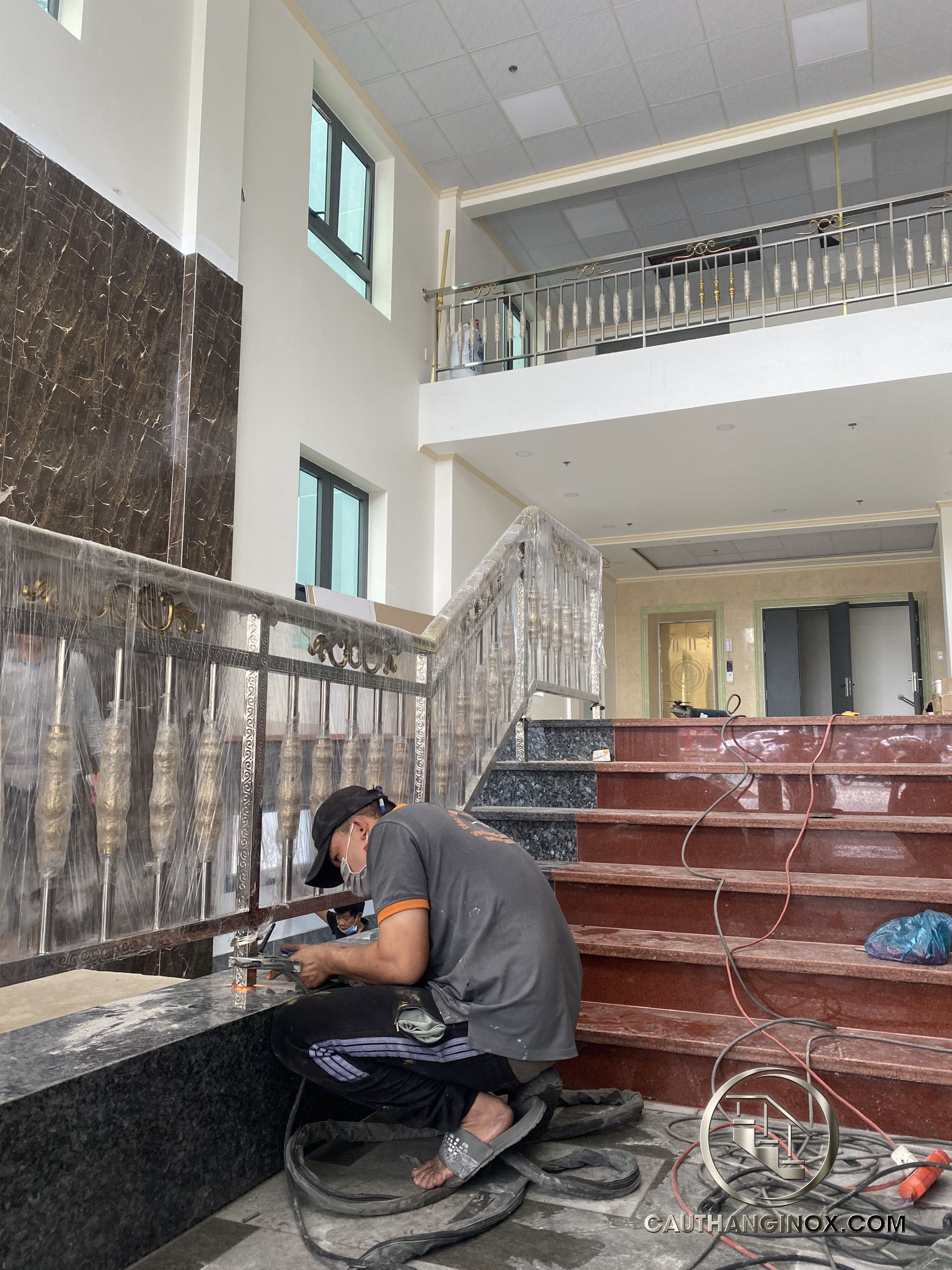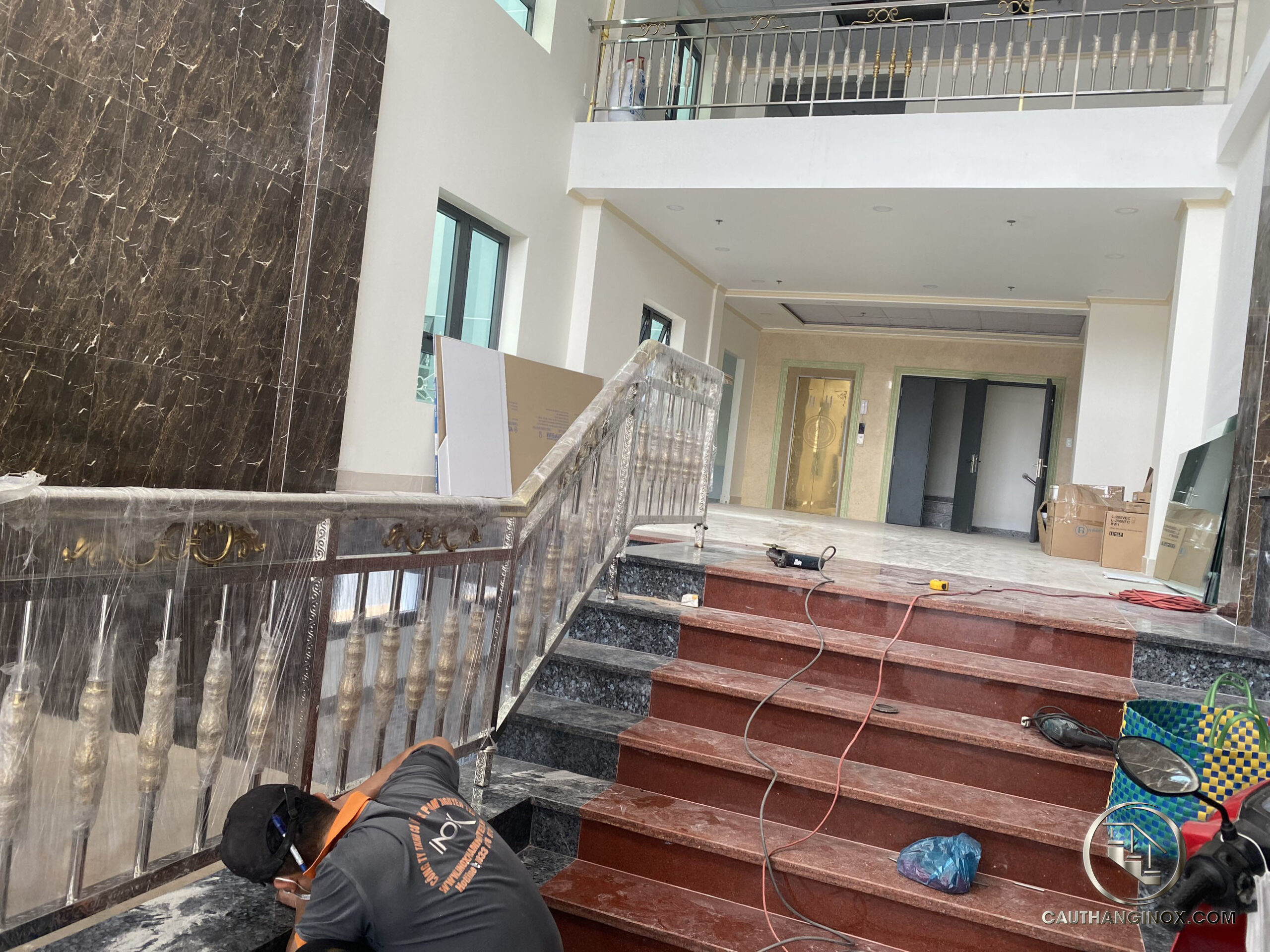 Công trình cầu thang inox vàng mang đến diện mạo sang trọng và đẳng cấp hơn hẳn cho công ty của chị Thảo Kim tọa lạc tại quận Tân Bình. Toàn bộ hệ thống được chế tác từ inox 304 mạ vàng PVD chống oxy hoá, đảm bảo độ bền vượt thời gian và giữ màu sáng bóng như mới. Từng chi tiết – từ tay vịn, trụ, lan can đến các mối nối – đều được gia công tinh xảo, lắp đặt chuẩn kỹ thuật, tạo nên tổng thể chắc chắn, an toàn và đầy tính thẩm mỹ.
