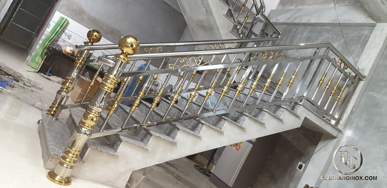Sử dụng chất liệu inox cao cấp mạ vàng PVD, toàn bộ hệ cầu thang nổi bật với độ bóng gương hoàn hảo, màu vàng sang trọng và khả năng chống trầy xước – chống oxy hóa vượt trội. Thiết kế được thi công theo phong cách tối giản nhưng tinh tế, từng đường bo, mối hàn và chi tiết trang trí đều được xử lý tỉ mỉ để đạt độ hoàn thiện cao nhất.